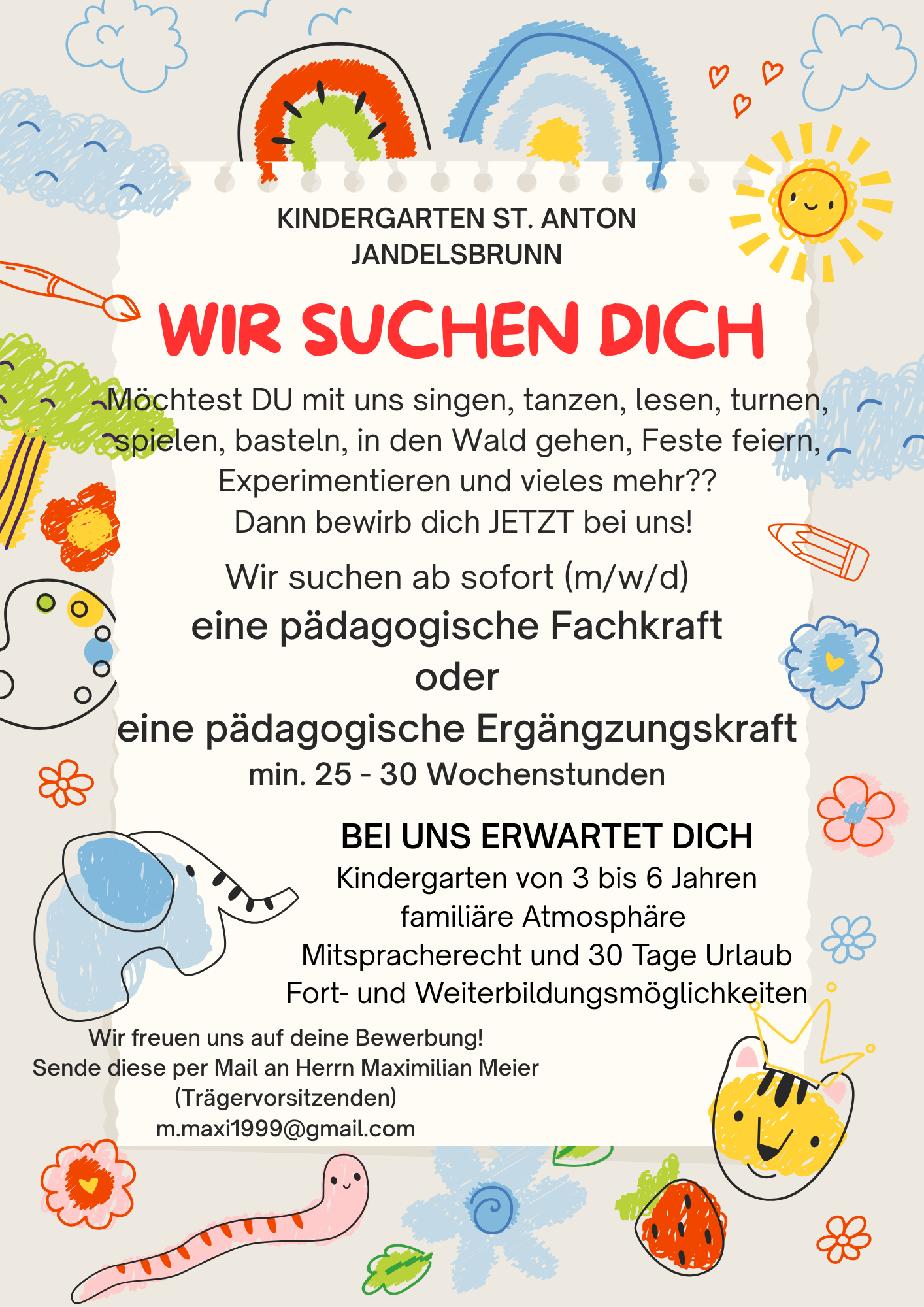 Der Kindergarten St. Anton Jandelsbrunn sucht ab sofort engagierte Unterstützung für unser Team.
